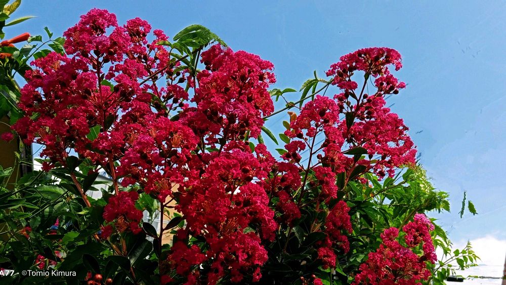 梅雨明け宣言の今日、青空を待っていたかの様に、小さな庭のサルスベリの花が、全開です。