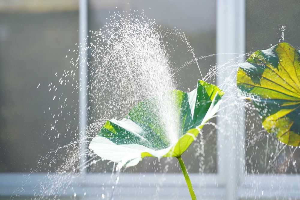 ハスの、茎から葉まで穴が開いている構造を利用して、茎にホースを繋いで水を流すと、葉からシャワーのように出て来るようですよ☺️