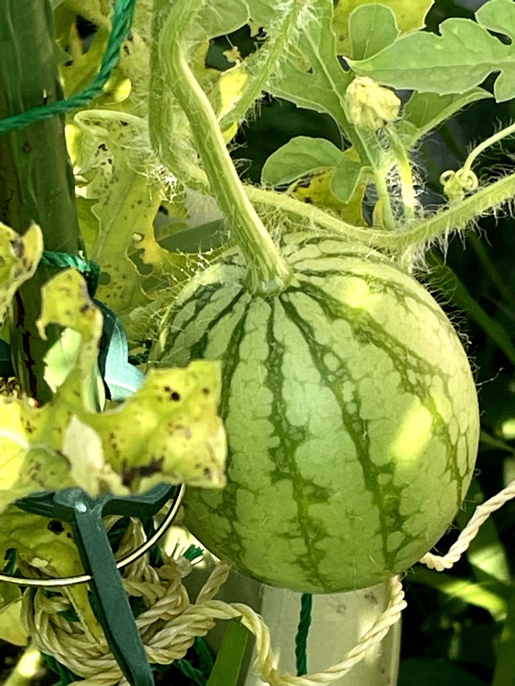 令和6年7月22日(月) ☀️ 当地 新聞📰予想最高最低気温 36℃ 27℃ 昼過ぎに雨☔ ٩(๑❛ᴗ❛๑)۶おはよーございます 気づいたら小玉スイカの鉢に実が下がっていました❣️😃(7/14に授粉? 収穫予定8/23)