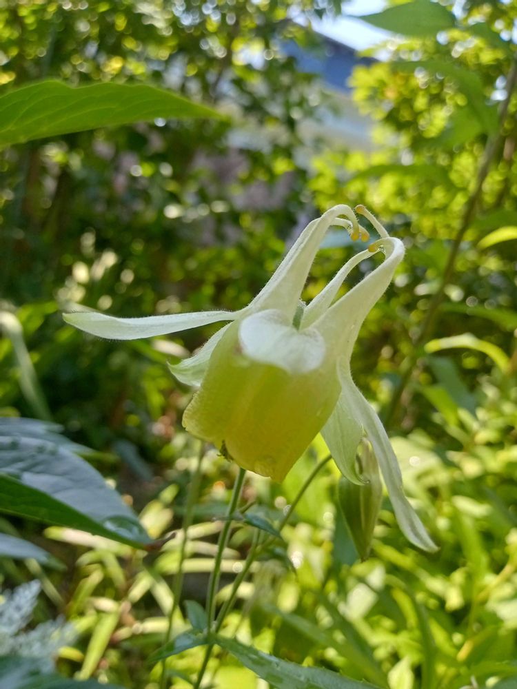 昨年ご近所さんから戴いたオダマキの白が咲きました。白というよりは薄グリーンです。