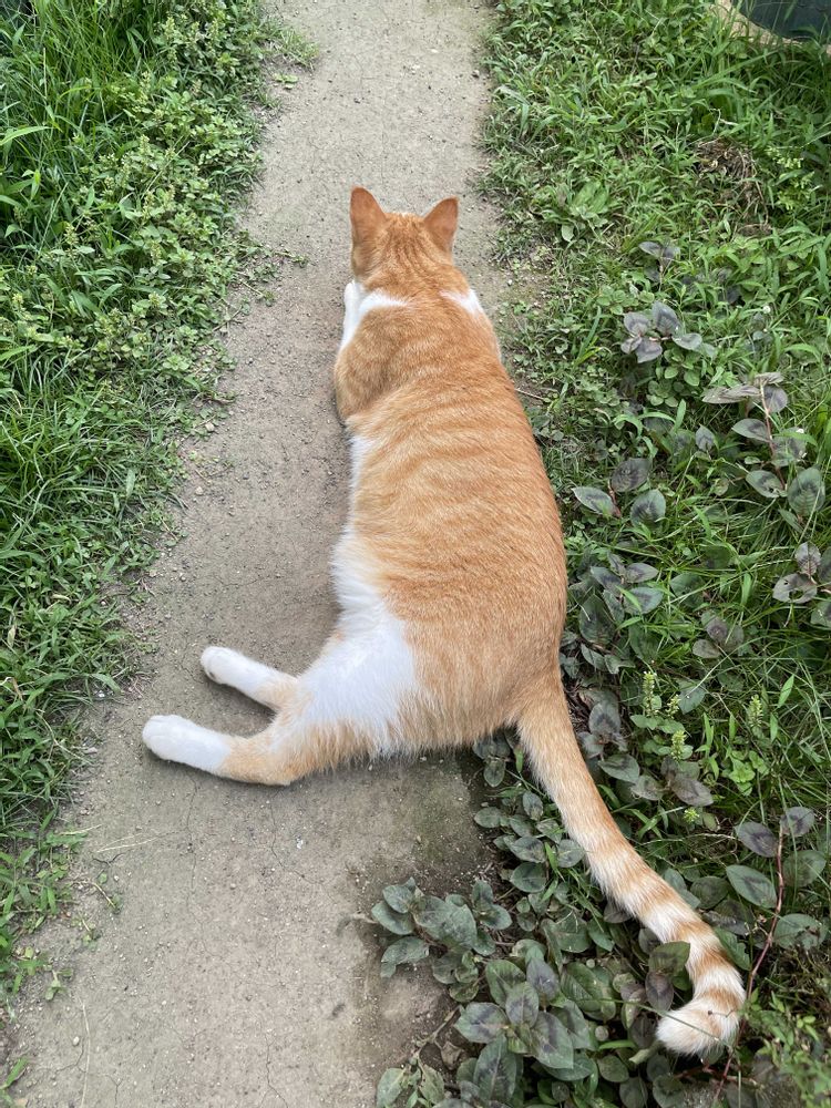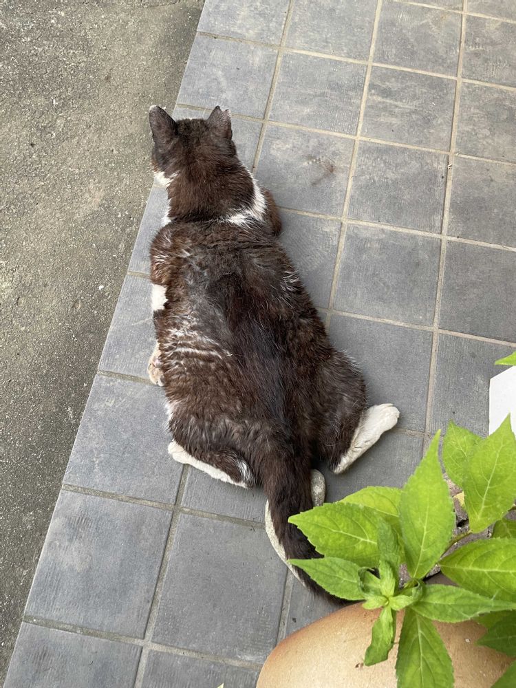 しかし、過酷な暑さの中、近所のニャン達は大変です。少しでも涼しい所を求めてはグダーってしています。そこは涼しくないだろってところで、ハンミョウ発見したようです。🐈