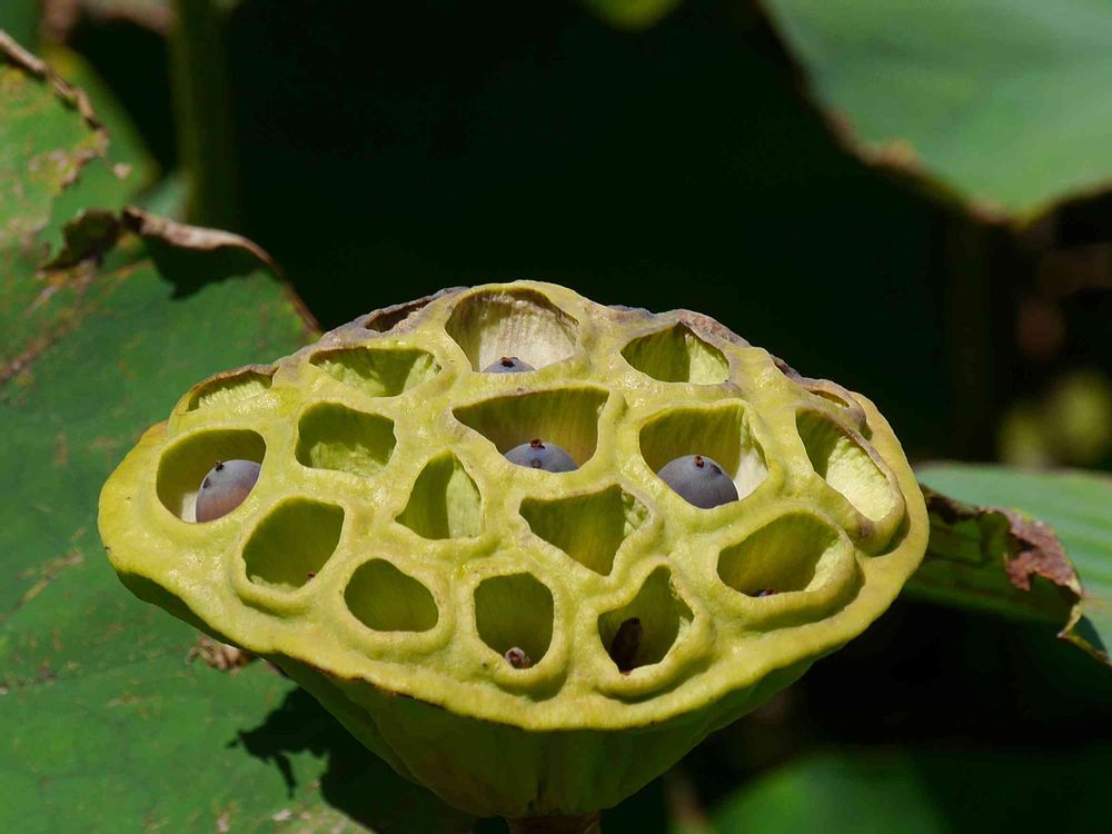 古代ハスの実、デカイ。 黒くなっているのが種。 種は、ドングリみたいな形です。