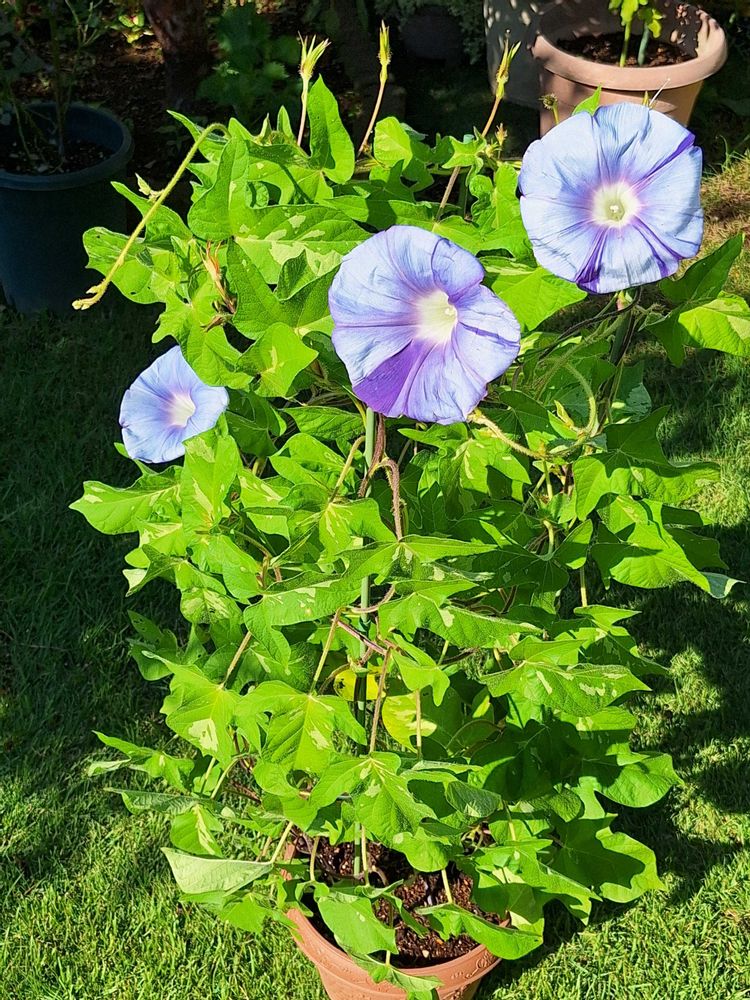 ①夕べの強風と雨で、今朝鉢ごと倒れたまま咲いていた行灯仕立ての流雲。😅