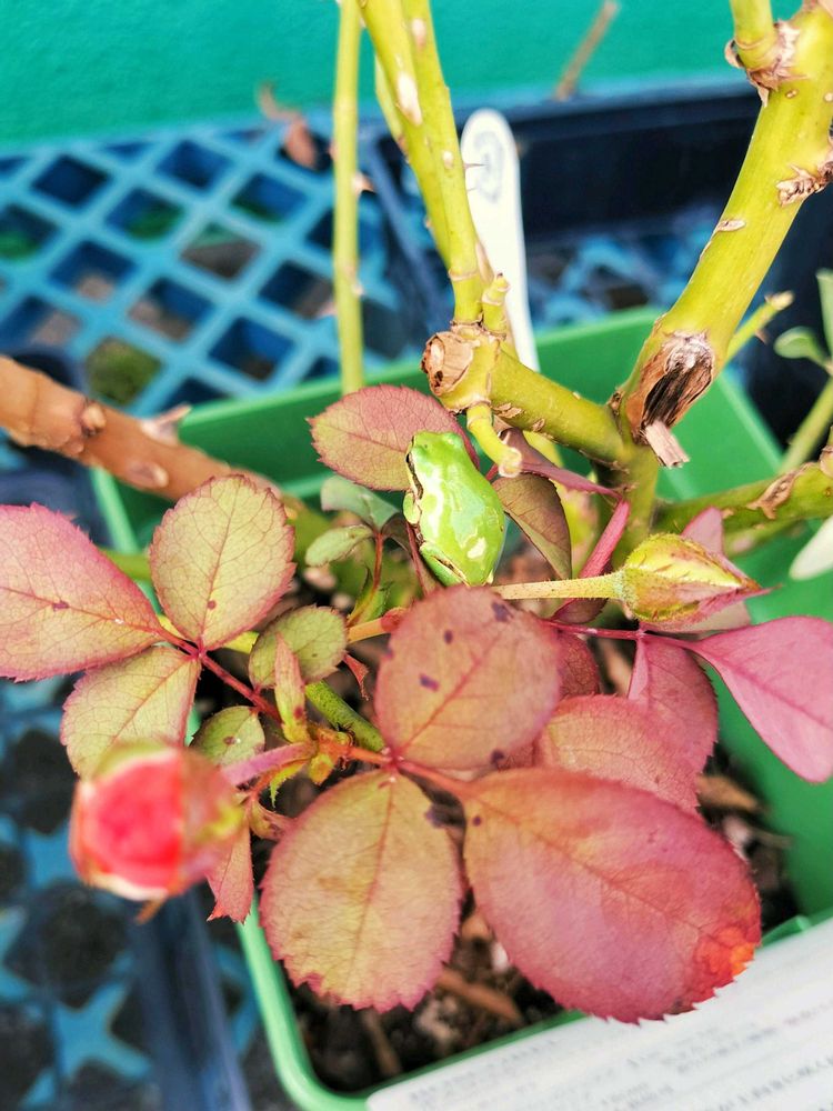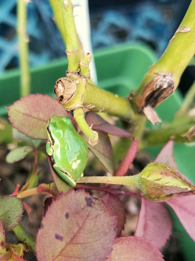 コメリにて売れ残りのバラに、極小サイズのアマガエルが…バラの葉っぱやつぼみと同じサイズ!小指の先くらいでツヤツヤしてました。