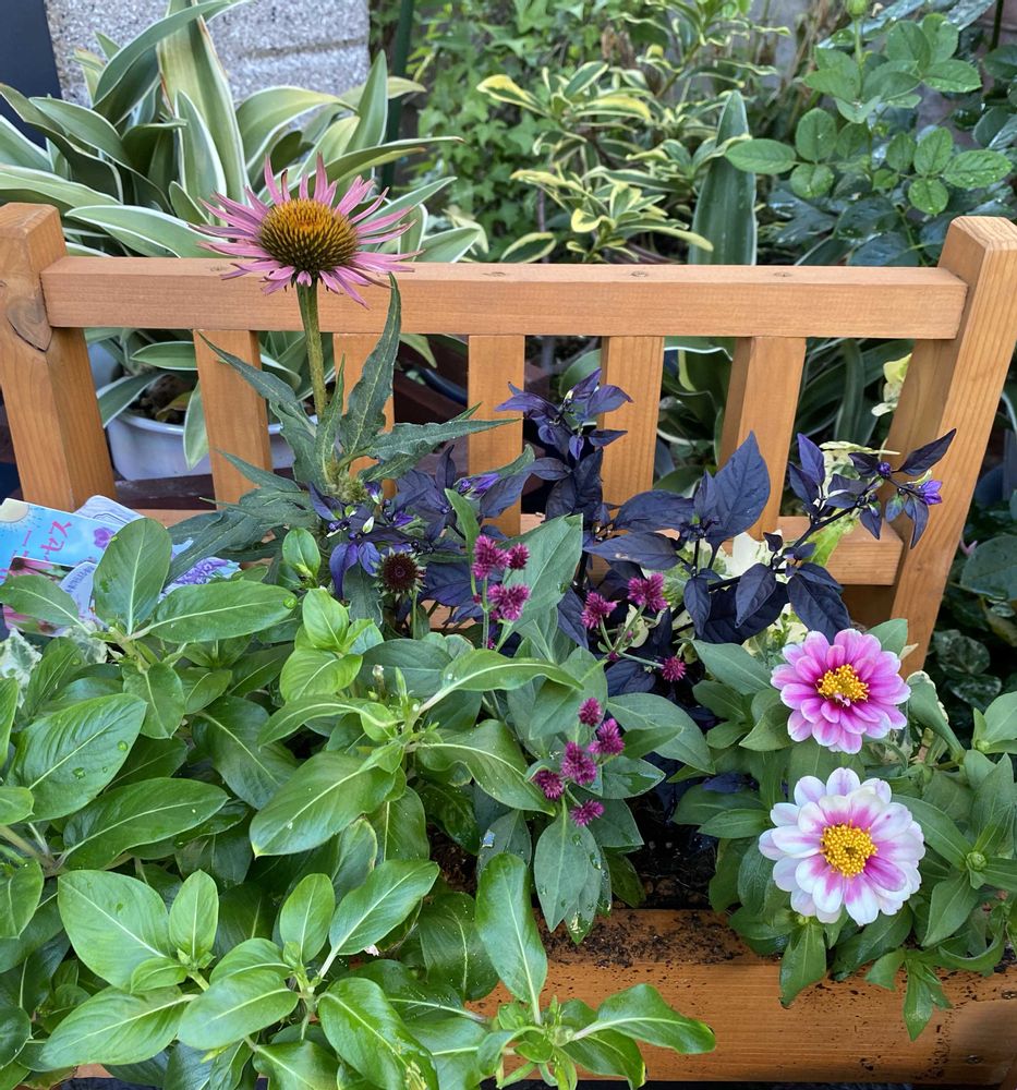 3枚目は前回の寄せ植えに使ったサントリーフラワーズさんのサニープリンセスをピンチして残しながら暑さに強いエキナセア、観賞用唐辛子、ジニア、千日紅花火をプラスしました💦
