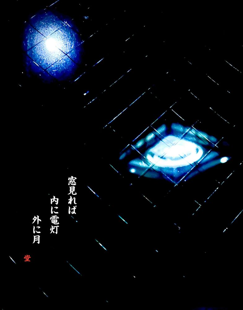 📝お月さまは、メッシュ:網目入りの窓の外側に見え、室内の電灯は窓が鏡のようになって写っているものデス🐶