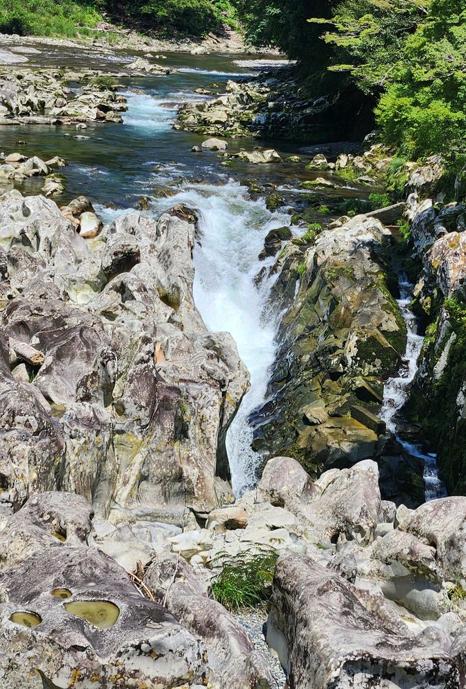 2️⃣上流、奇岩の続く川底も水量が少ない。低い滝を繰り返しながら