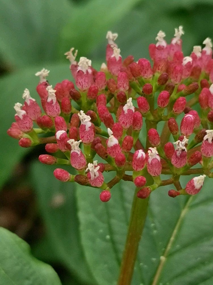・独特の対生の葉序の中心に、とても細かい真っ赤な蕾の花序がつき、蕾が割れて白い花がほとんど開かずに咲き、雄しべが外に突き出す