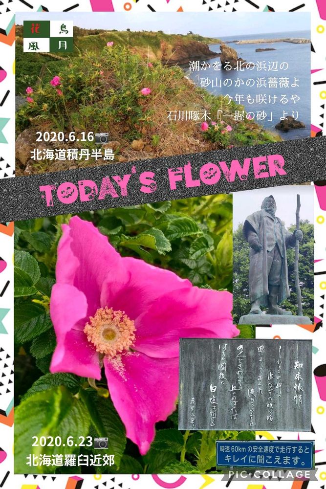 で始まる「知床旅情」この歌で一躍有名になったハマナス。この歌碑が羅臼のしおかぜ公園📷にその曲を作詞作曲した森繁久彌扮する「オホーツクの老人」像とともに飾られており半島の反対側ウトロにも歌碑が。羅臼に近い標津町にはその🎶が流れるメロディーラインが。また歌人石川啄木の歌集「一握の砂」にも登場する。