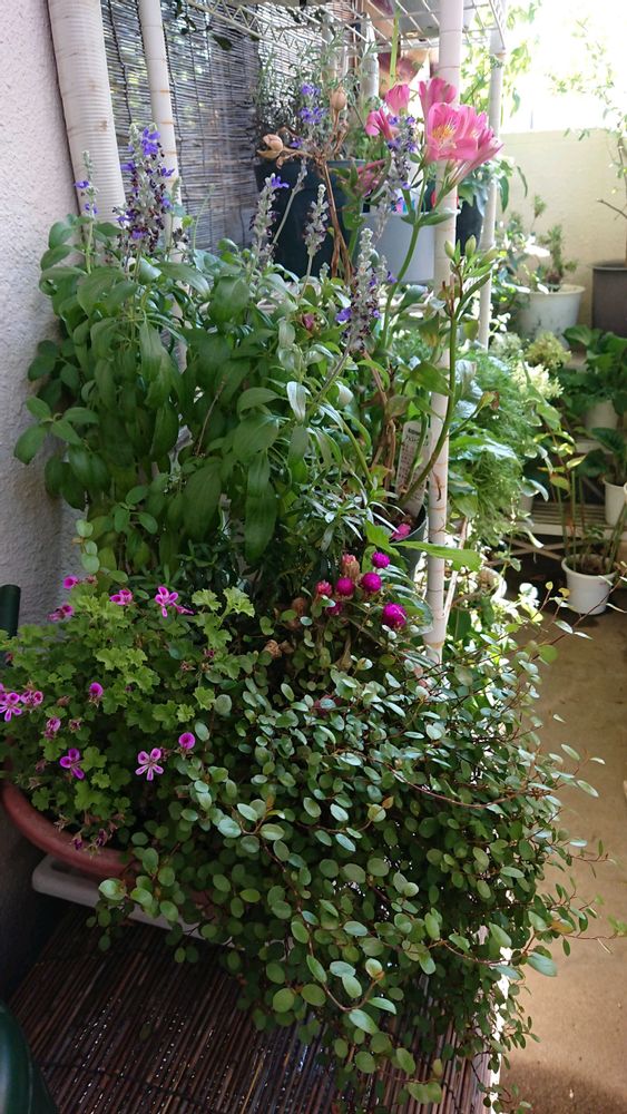 5月からずーっと咲きつづけてる寄せ植え。ブルーサルビアと千日紅、ゼラニウムと、、、ワイヤープランツがすごーく元気🎵❗見てるだけでこっちも元気もらえます😃❗