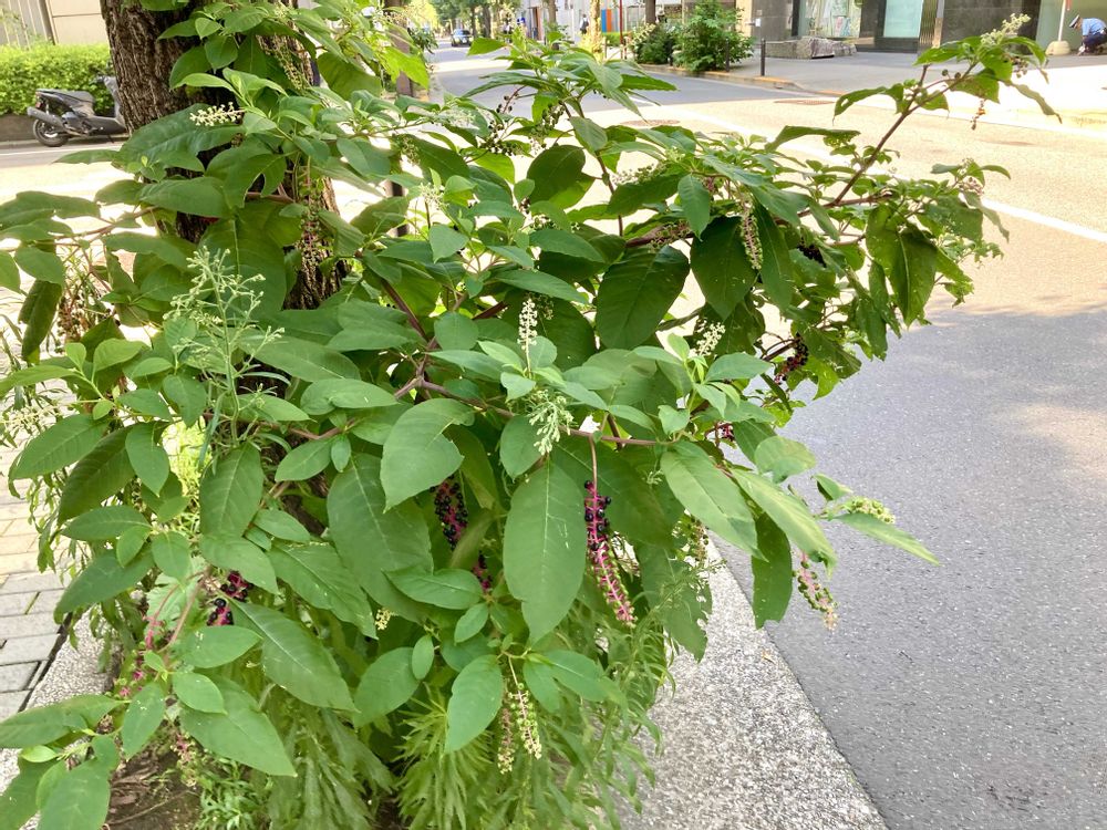 プリンス通りの城西大学前で「ヨウシュヤマゴボウ」の実が紫色に色づいていた。