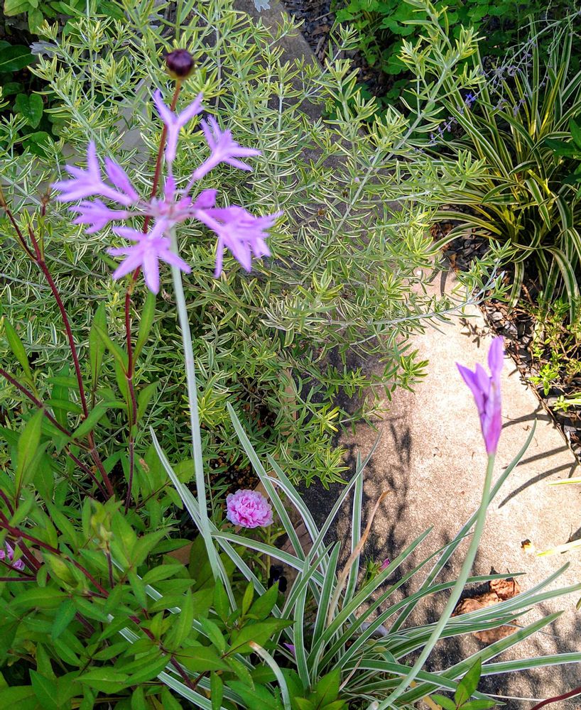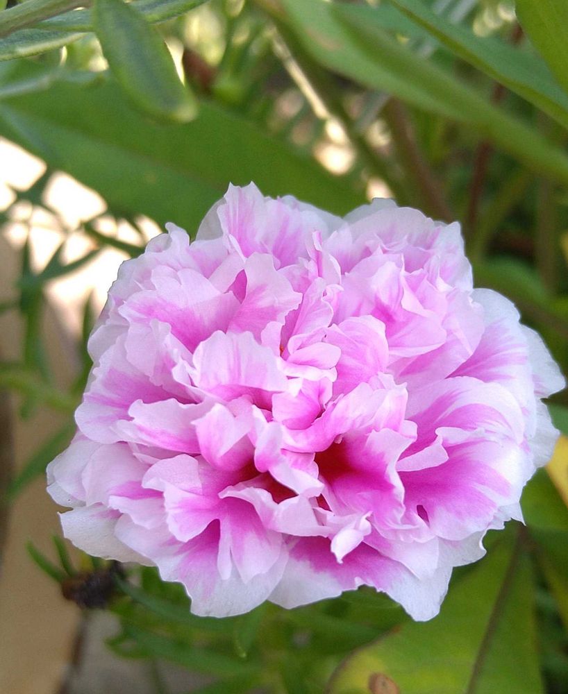 すぐ側にある鉢では、斑入り葉のツルバキアと八重咲きのマツバボタンが咲き始めました🎶