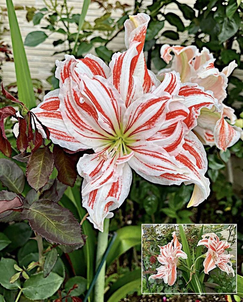 *<後に理解したことであるが、その草花は、春の球根の王様と言われるアマリリス。大輪の八重咲き品種であるという。植えてから70日程で1茎から3~4輪の大輪の花が咲くという。ダンシングクィーンは白に赤が入った八重咲きであると。>