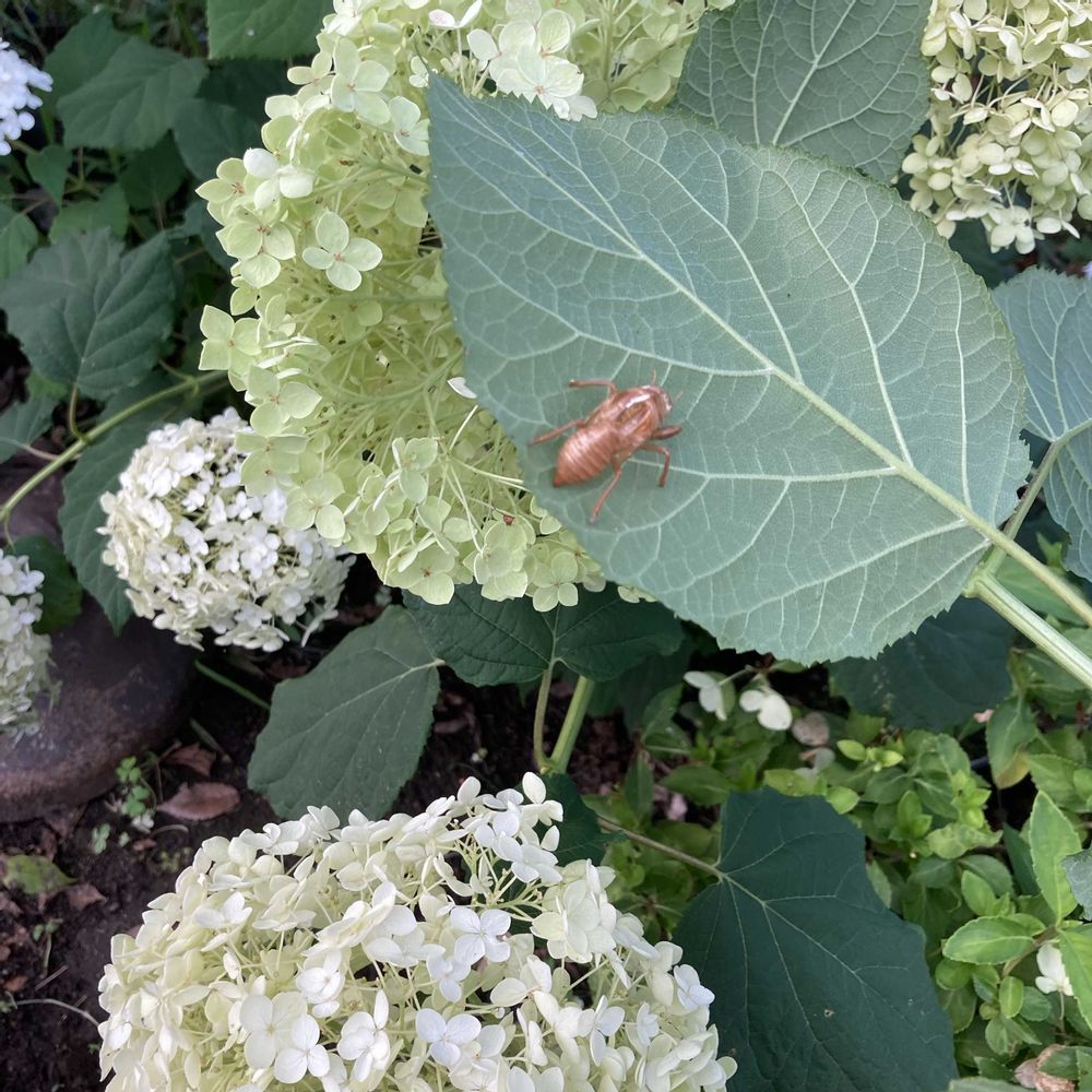 アナベルがグリーンになってきたので、そろそろカットしてドライフラワーにしようと思ったら、セミのぬけがらがあってびっくりΣ( ˙꒳˙ )
