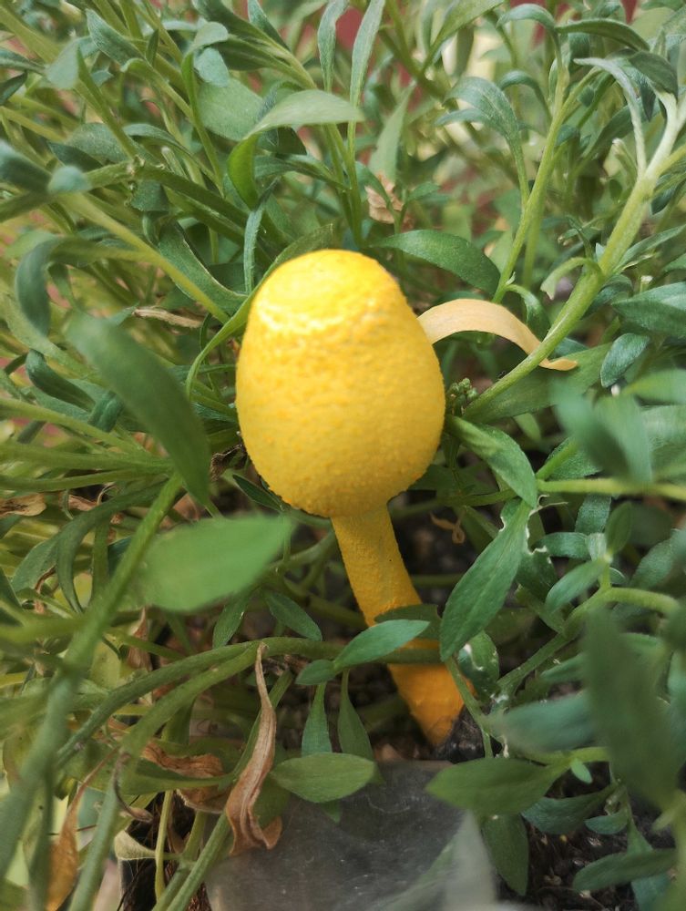 枯れかけのアリッサムの鉢に鮮やかな黄色のキノコ生えた!
