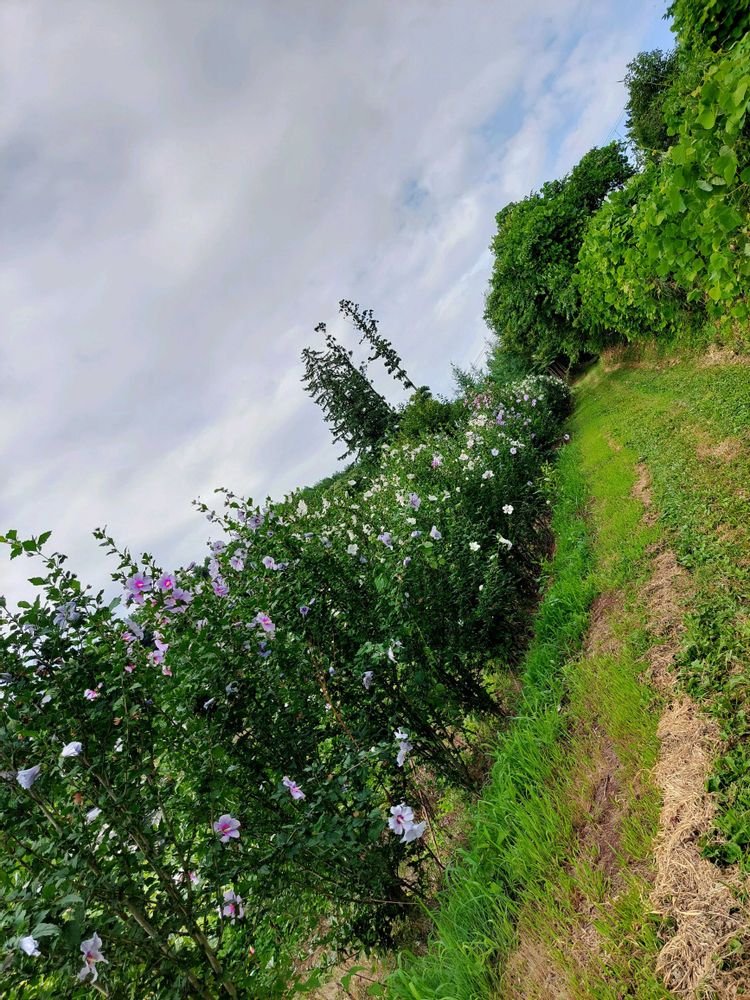⑴裏山に(丘?)に続く路に、こぼれ種からのムクゲ植えました。