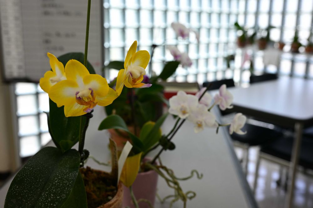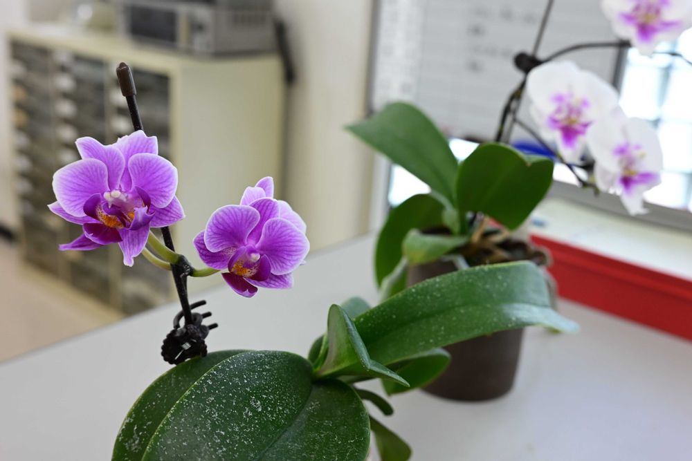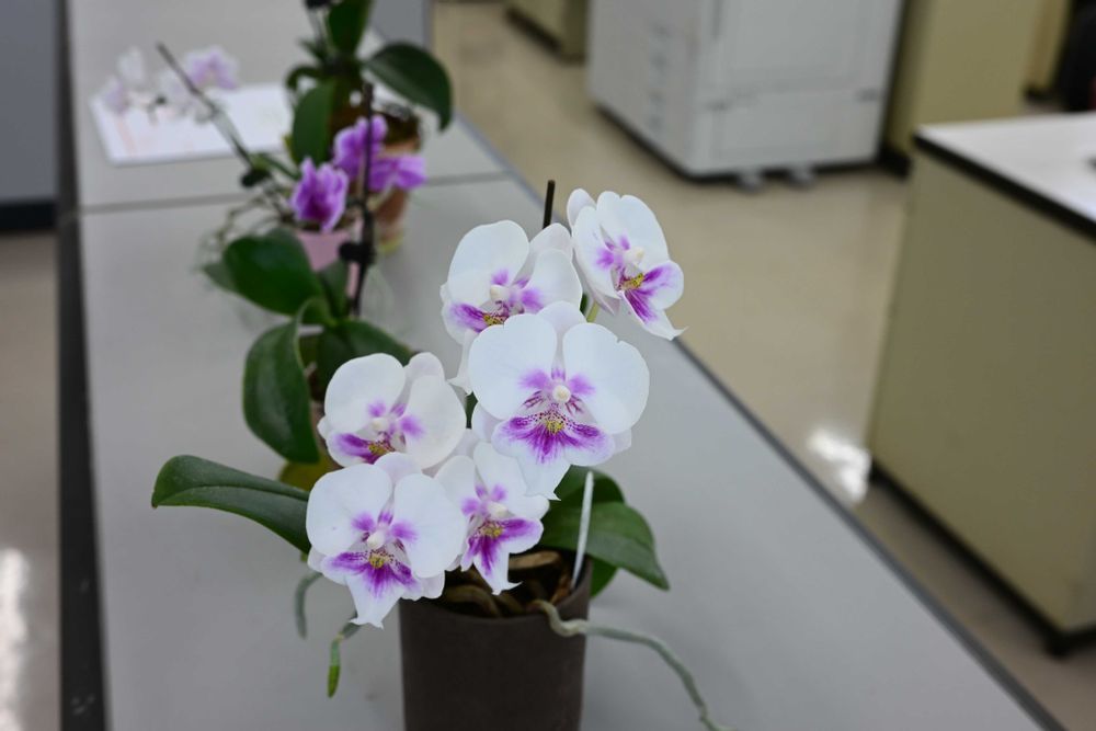 酷暑の自宅ベランダで咲いてていただくのは忍びないので、会社玄関&カウンター。
