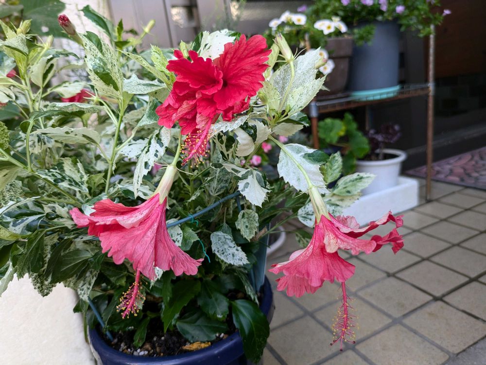 🌺斑入りミニハイビスカスは去年ジュンテンドーで見切りで購入 どうにか冬越しして鉢増ししたら沢山花を付けてくれました🌺🌺💖