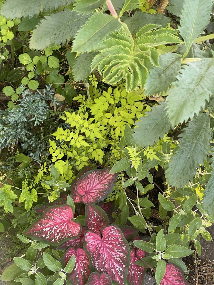 カラジウムの地植えも黄緑のジャスミンフィオナサンライズとトロピカルな雰囲気💚