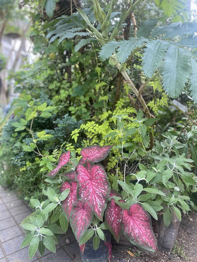 ボルドーっぽい赤色が、カラジウムの赤とマッチしていてステキ💕