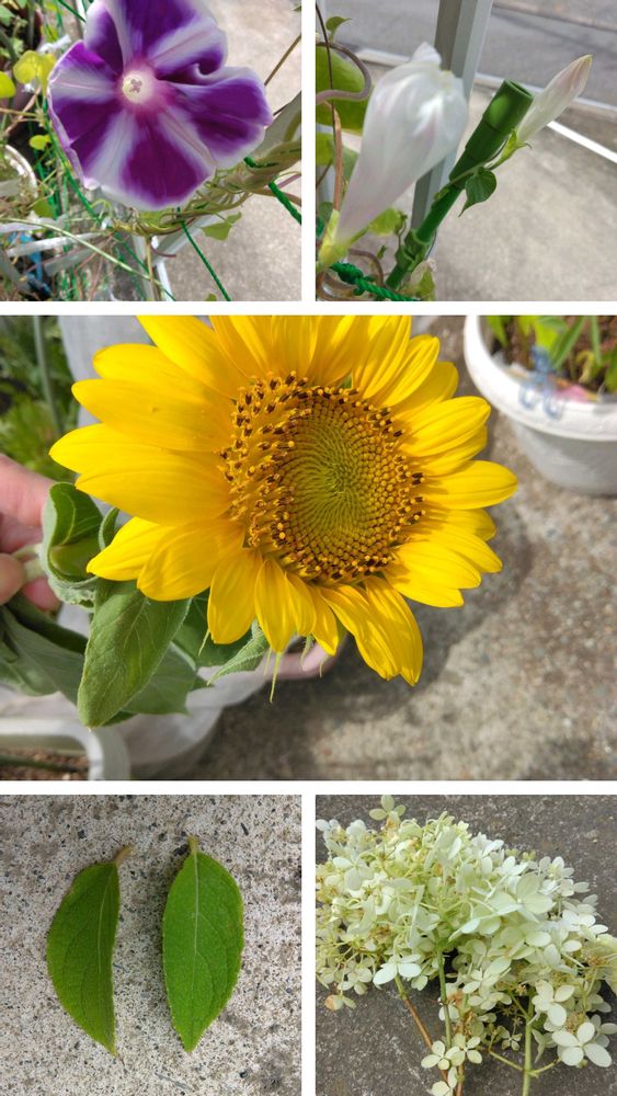 朝顔と日々草、紫陽花を切り花に葉も記録の為撮影