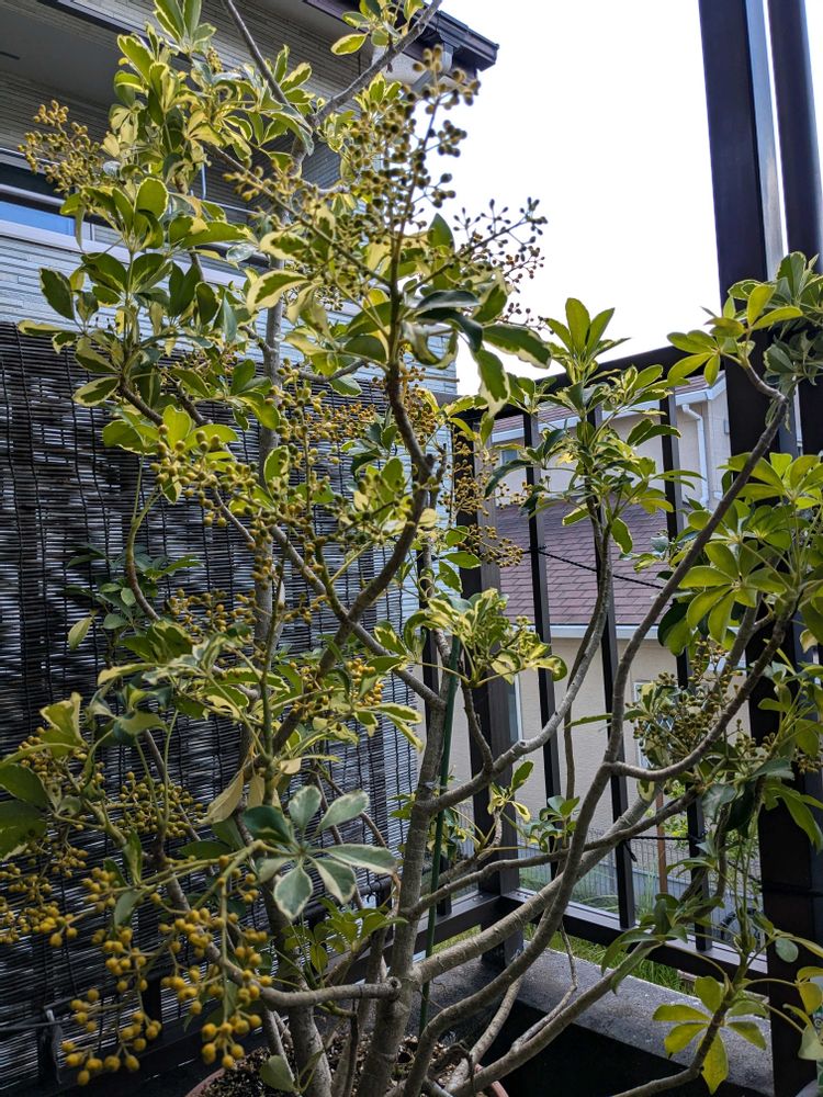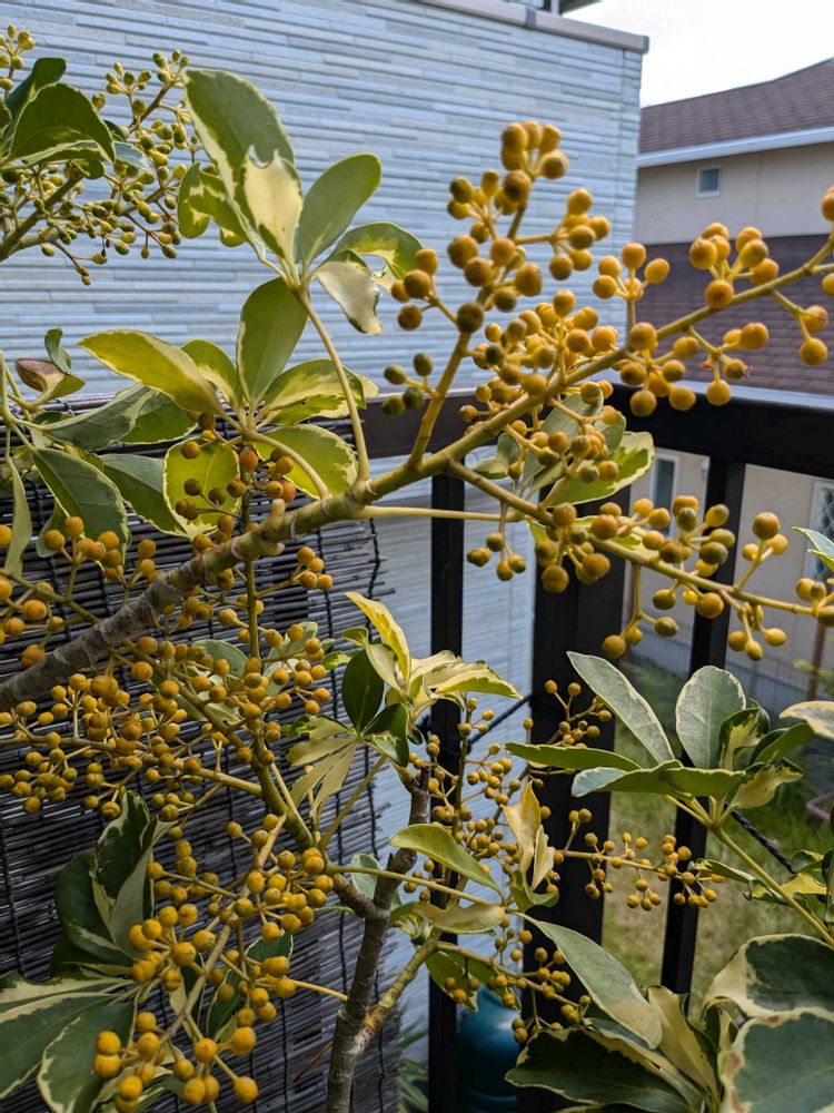 猛暑にも負けずに長寿斑入りホンコンカポックに沢山の実が‼️💪👀🎶