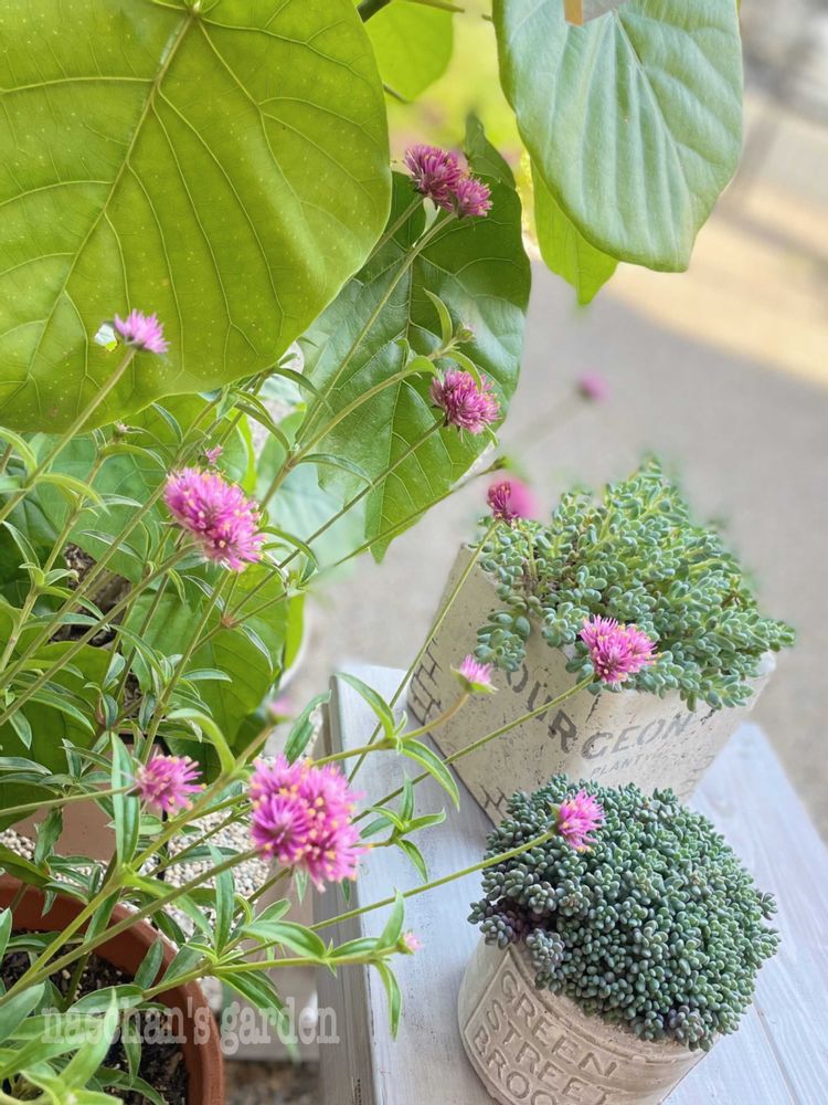 ゴンブレナ ラブラブラブとウンベラータは暑くても元気いっぱい😄とくにウンベラータは冬に調子をくずして思い切ってカット✂️して棒だけになったのに今はワサワサですꉂ🤭