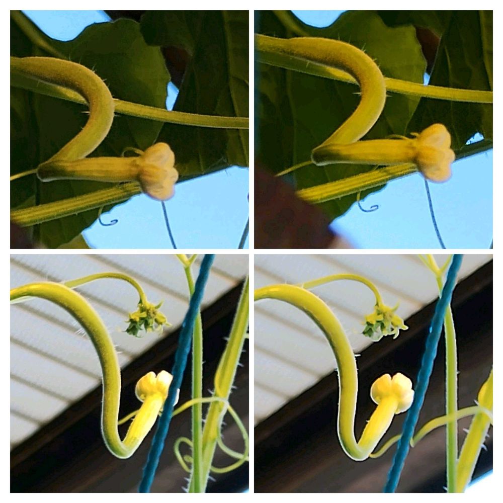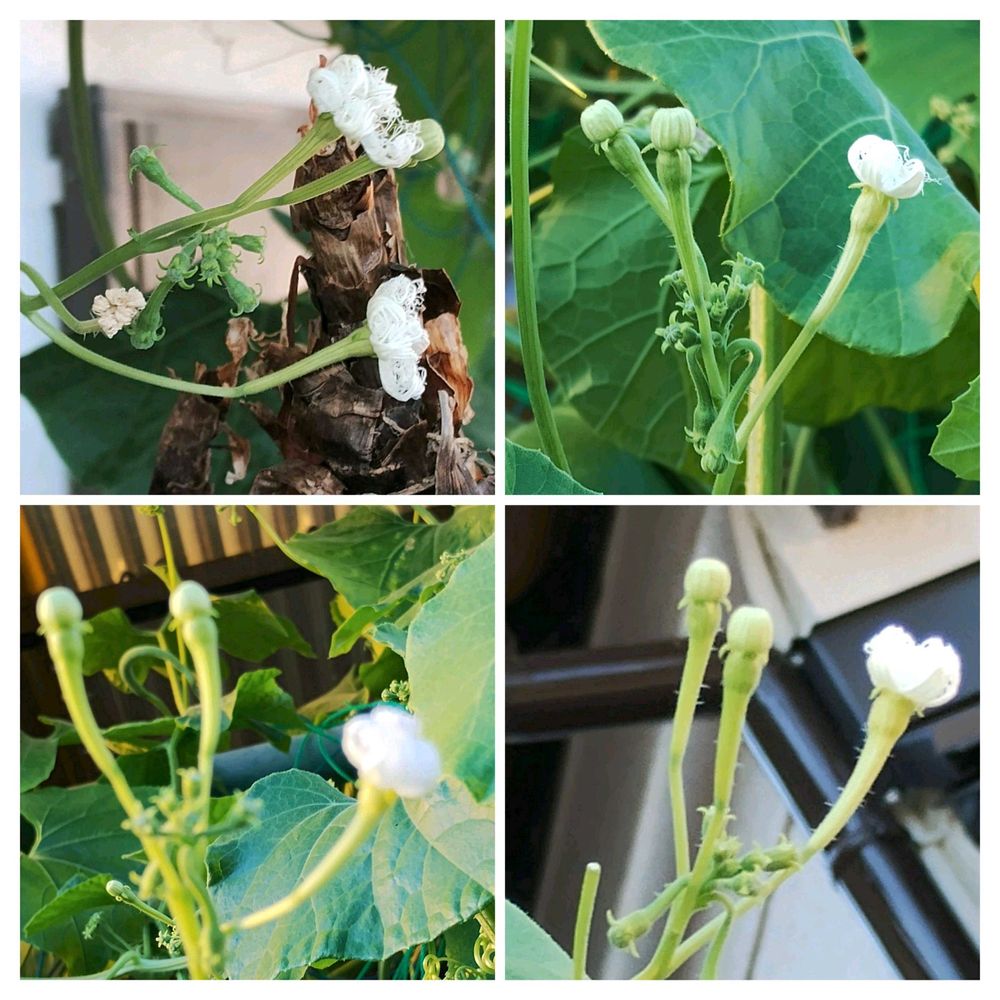 ヘビウリ出来てた✌✌ヘビウリの花は不思議だよ、雌花はヘビウリの先に付き雄花は脇芽から沢山花咲く、NHK趣味の園芸で聞いた実験をした、蔓延る芝草に、引いても引いても出て来る草に沸騰した湯を掛けてみた、😳😳本当、草枯れてきた😳除草剤より根こそぎ枯れると聞いたが本当だったよ