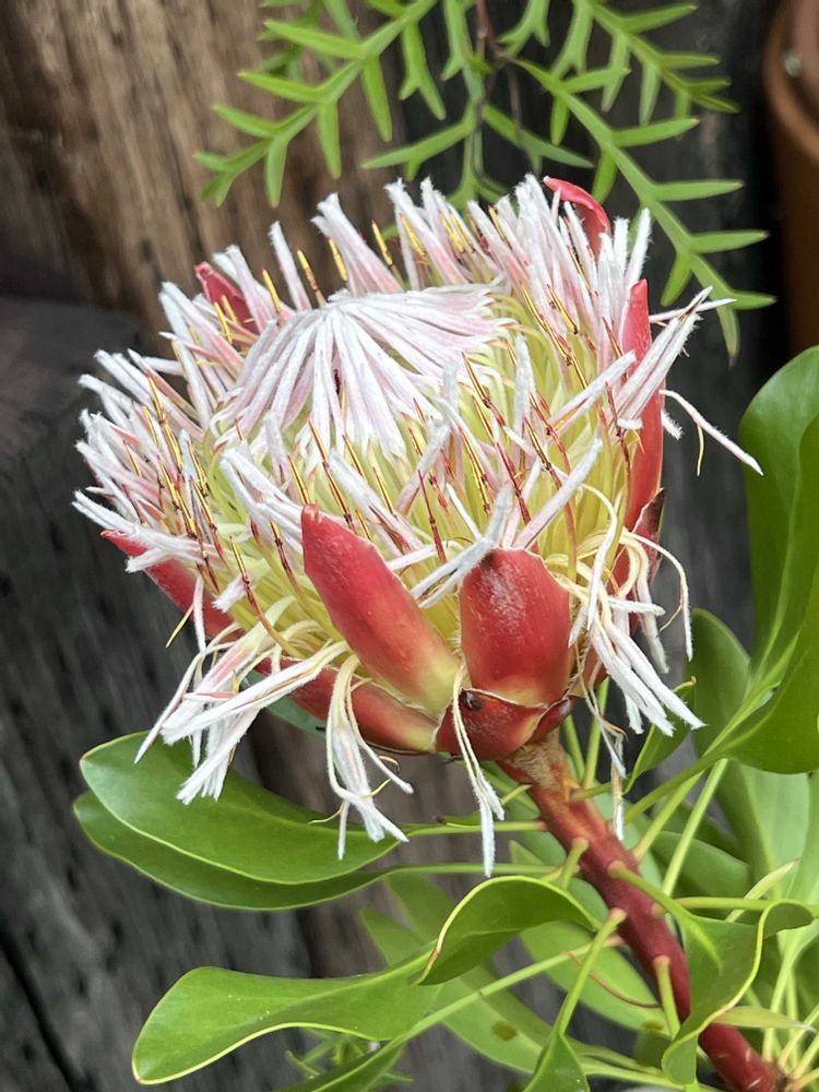 おはようございます☺️PEKO地方晴れ☀️朝から暑い🥵プロテア リトルプリンス満開 3枚目は何と挿し木成功かも💖