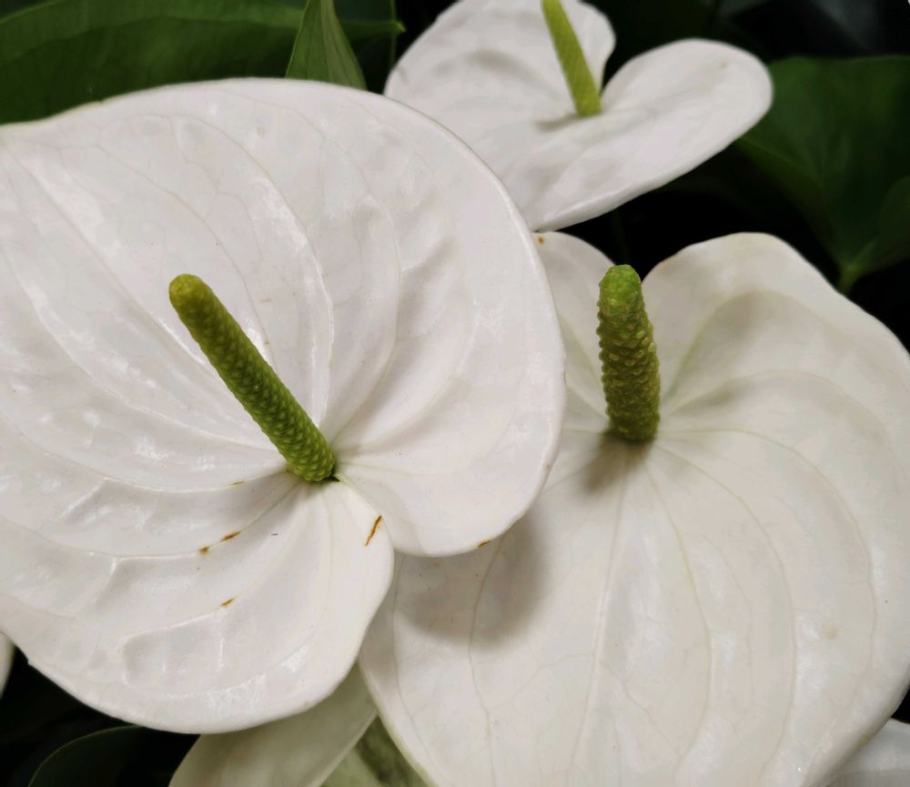 アンスリウム、赤とかピンクは見慣れてますが、白もきれいですね。リビングとかにあると涼しげにも感じるかもしれませんね。