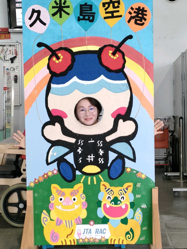 久米島のキャラクターは久米島ホタルを題材にした『く〜みん』の顔出しパネルがありました。本名は球美久米子(くみくめこ)だそうです。