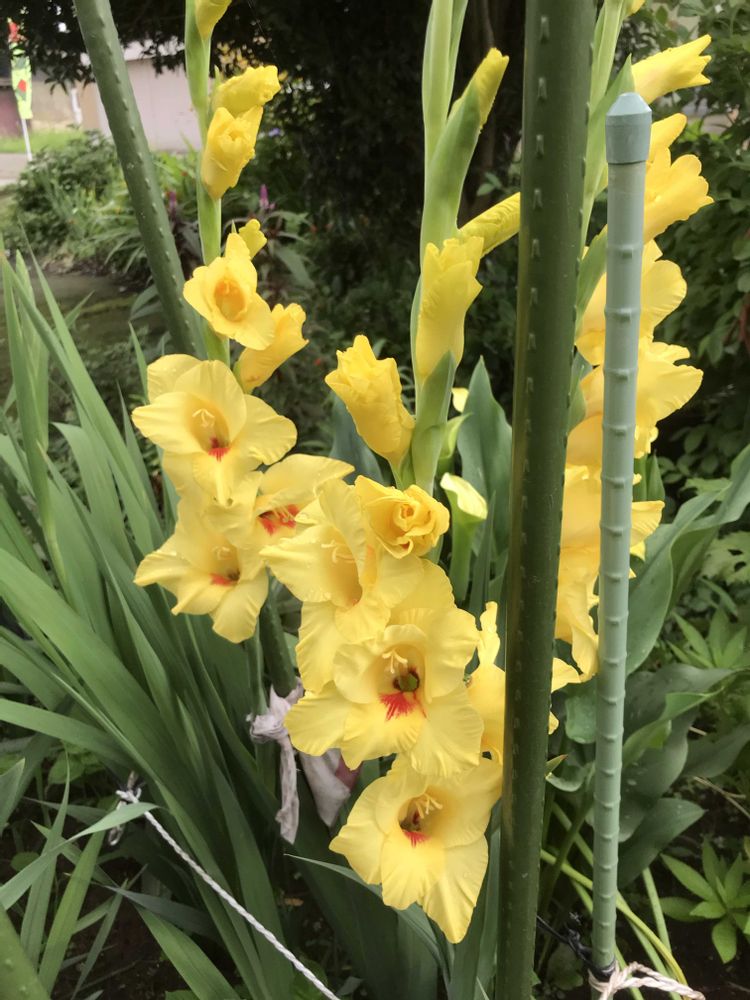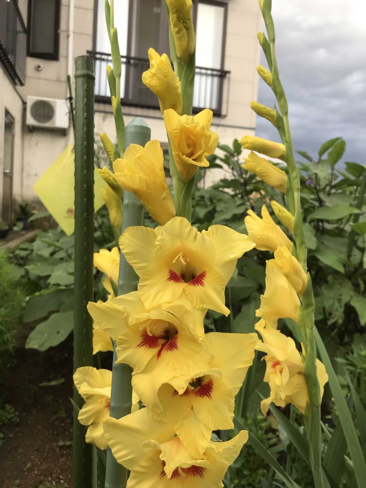 黄色の中に赤色が入った可愛いグラジオラス咲いたよー😍