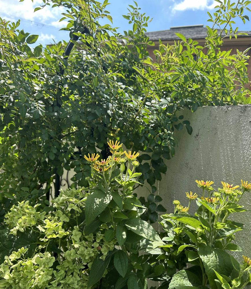 猛暑の中、ルドベキア・リトルヘンリーとグリーンになったアナベルが素敵にコラボしてくれています。