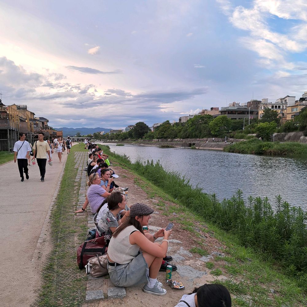 四条通りから鴨川の河原道を抜け三条通りに抜けてみた 夕方の涼みを多くの人が楽しんでいた