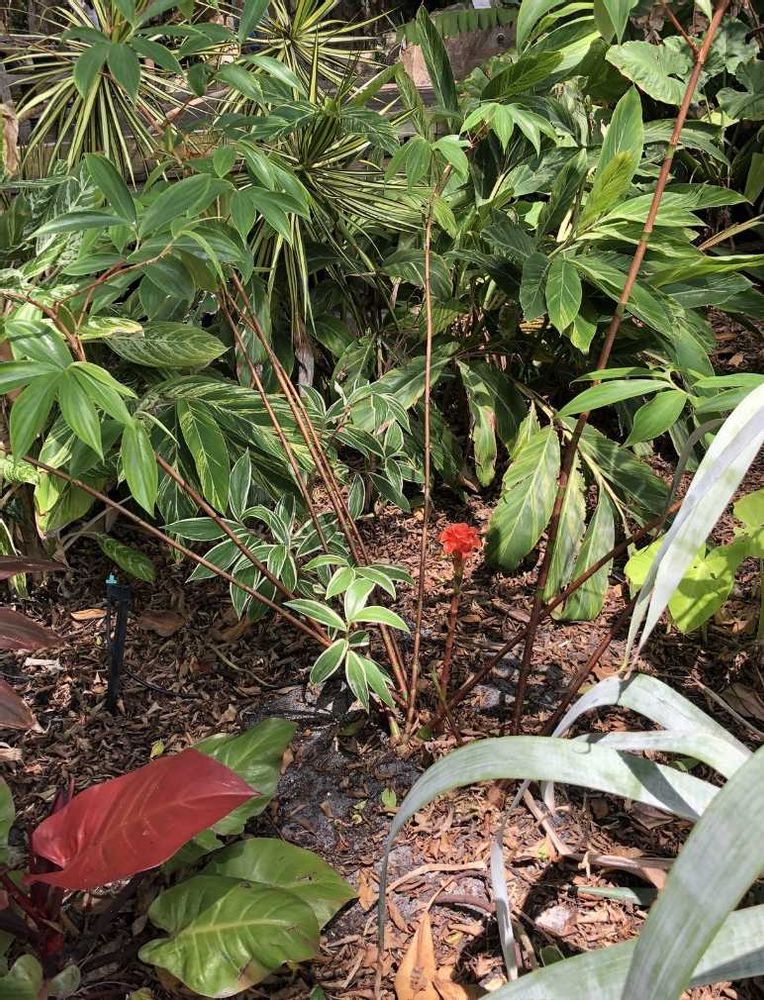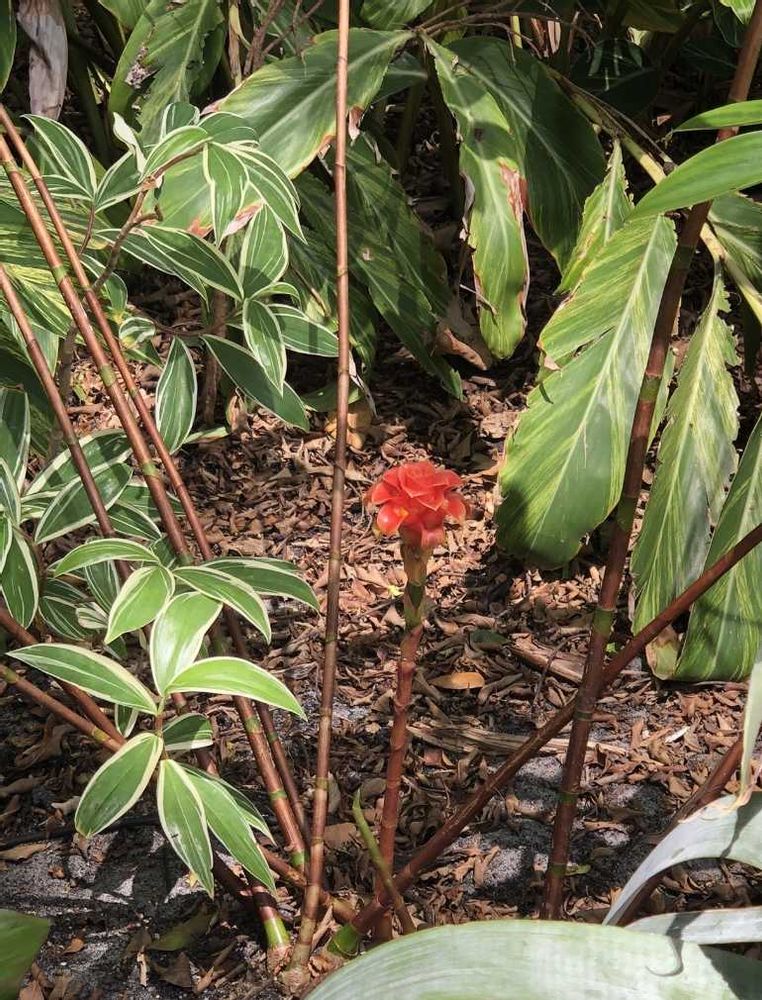 初めて見たコンロンカなので、不思議な植物だなぁと感動しました。マツカサジンジャーは赤い茎がたくさん生えていて、お花はひとつだけ咲き始めていました。