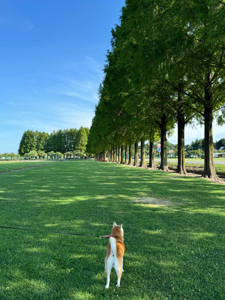 朝🐕散歩はメタセコイアのこの貴重な日陰を行ったり来たりするだけ
