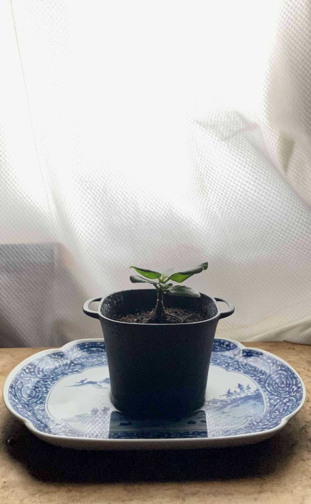 昨日のケロヨンおけは流石になんかなと。 物置を探したら、なんか良さげな大皿が出てきたのでとりあえずこれに水をうすく張り、そのうえに鉢をのせて若干の保湿を試みてみました。(加湿器が使えないならこういう方法も良いとChat-GPT御推薦……ほんとだろか)