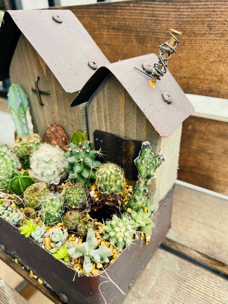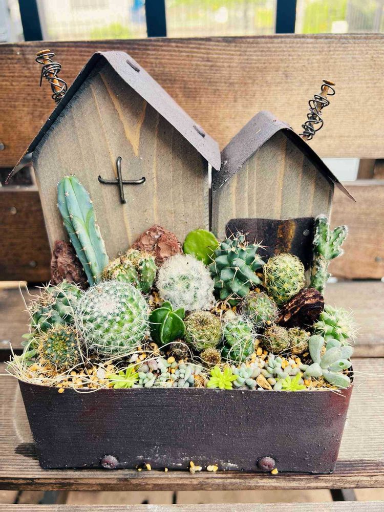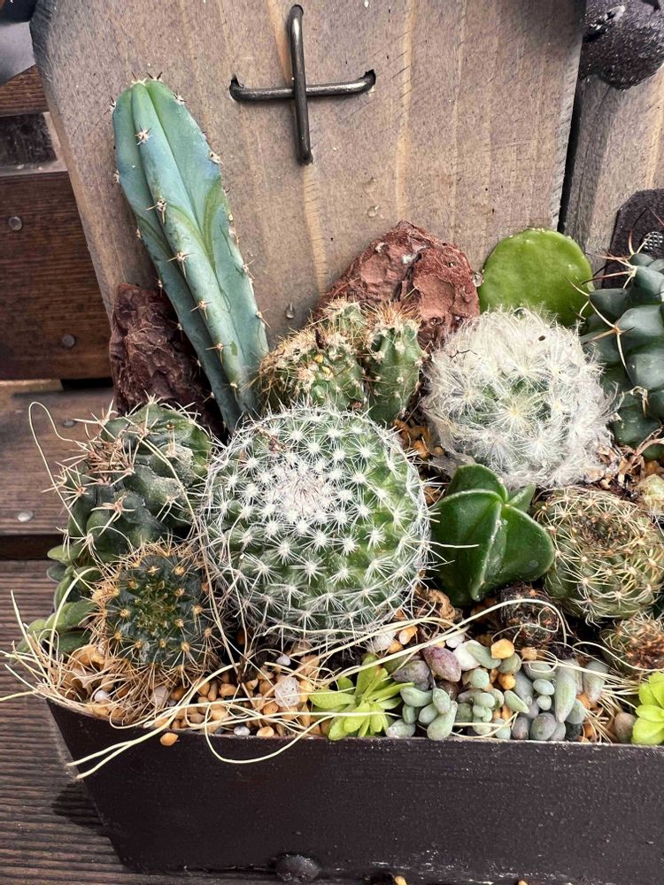 この寄せ植え、ステキですね!サボテン🌵は木の鉢とあいますね💕
