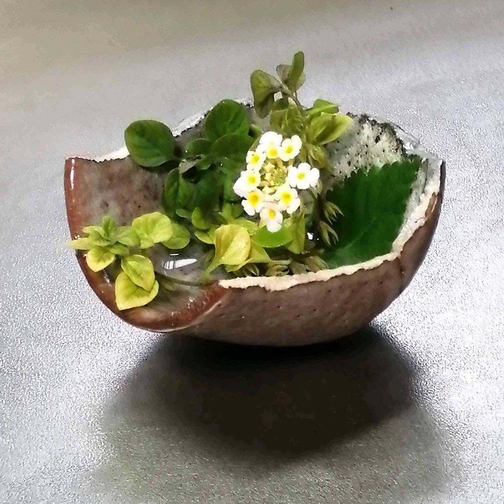 割れた抹茶碗に、生けて見ました😘ランタタナと、コナスビ😉