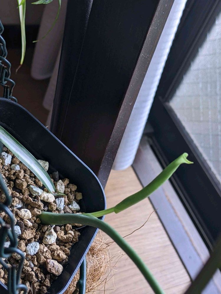 モンステラは大きくなると怖いのでこのペースがちょうどいいんですが、今年は少し様子が違って、新芽らしきものが出てきました。