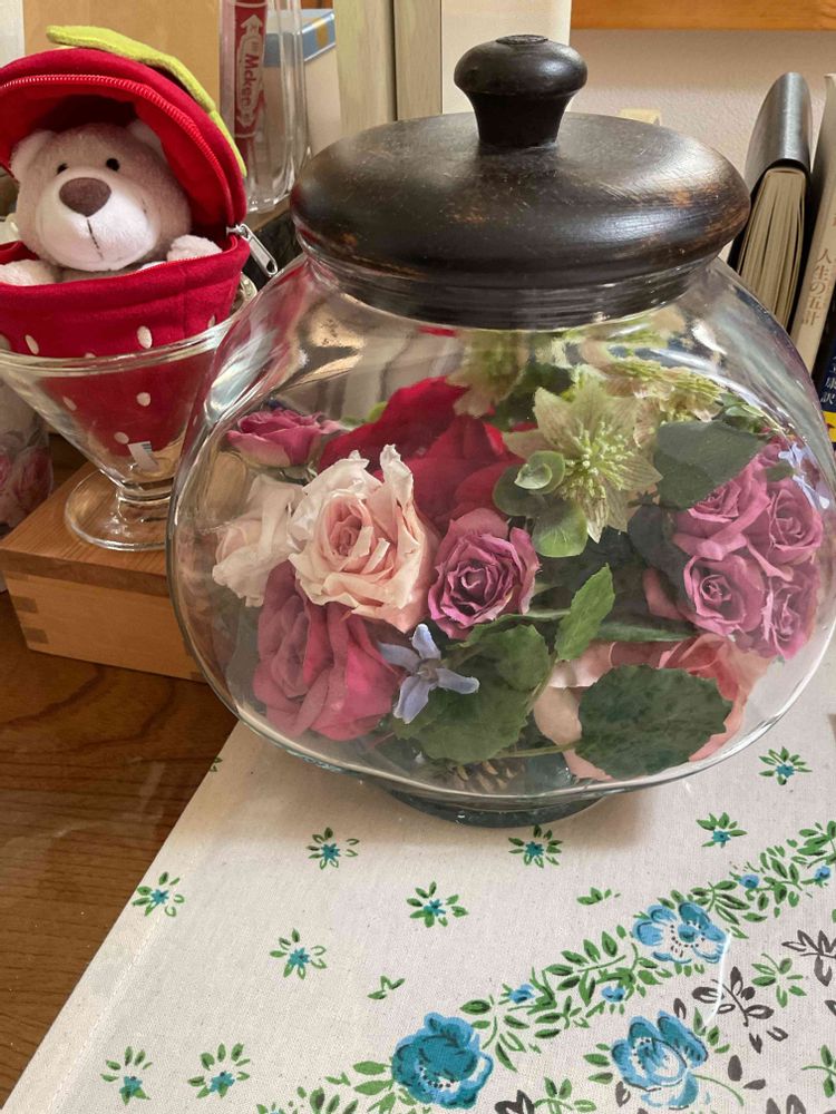 オアシスに 挿して ありましたが、埃 被るので、13年振りに バラして、金魚鉢のガラスが 有ったので、この間 閉じ込めてみました❣️
