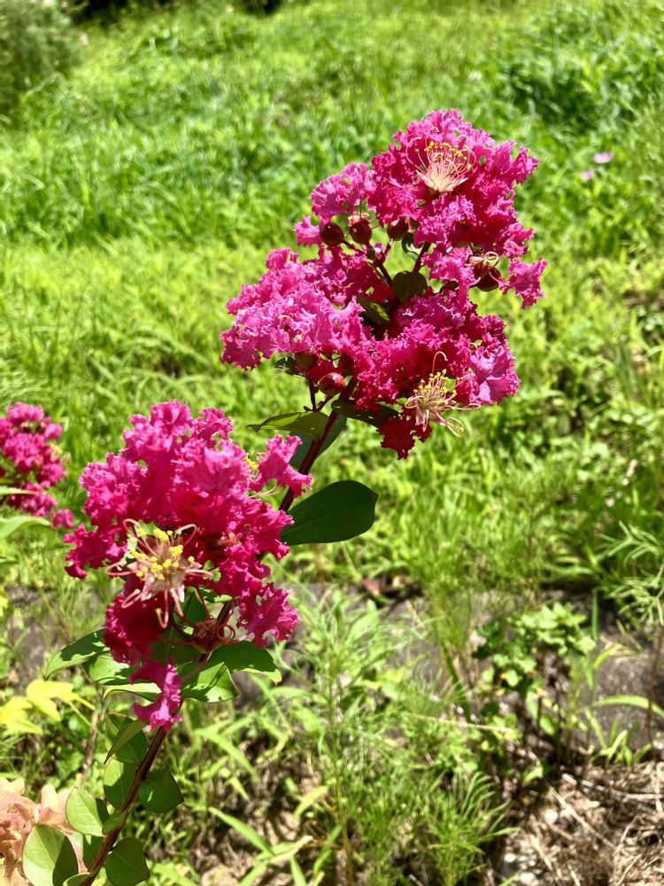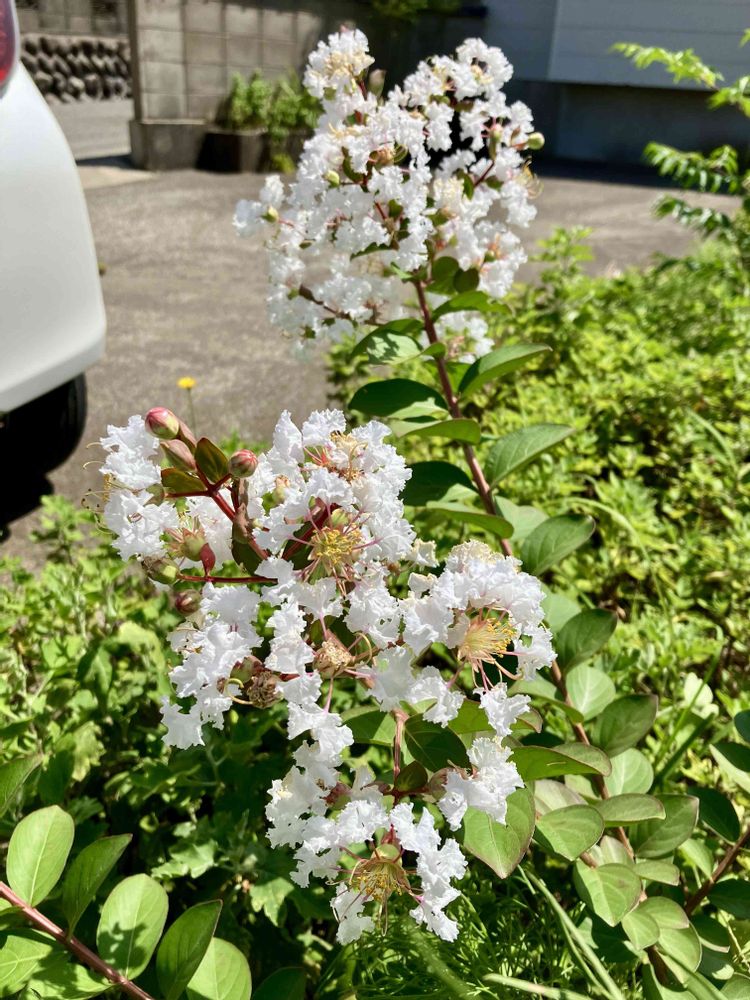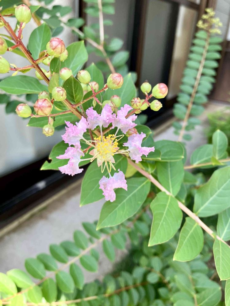 去年くらいから庭のあちこちで小さい百日紅が花を咲かせているのですが、身に覚えが無い色のお花が😅