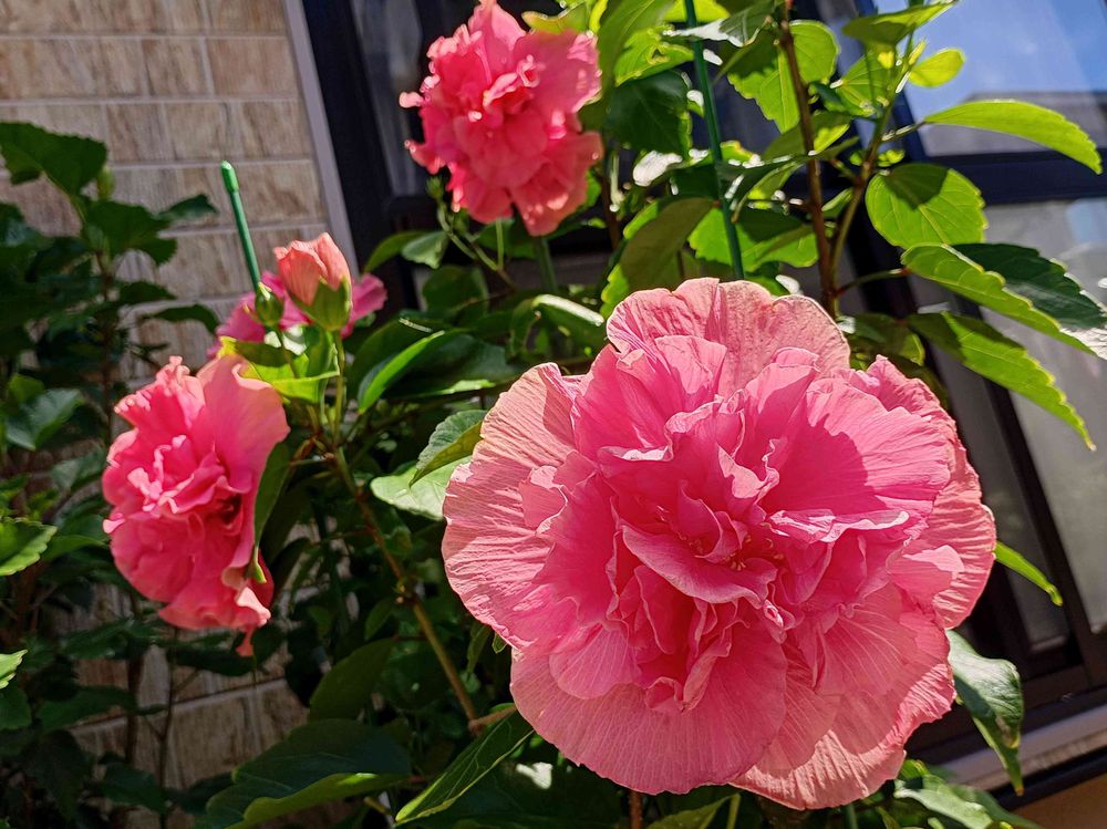 ✤アドニス、ダブルピンク4輪(花首が重すぎ、下向きになるので支柱で支えながら 1輪は手まり15cm超え😅👍)
