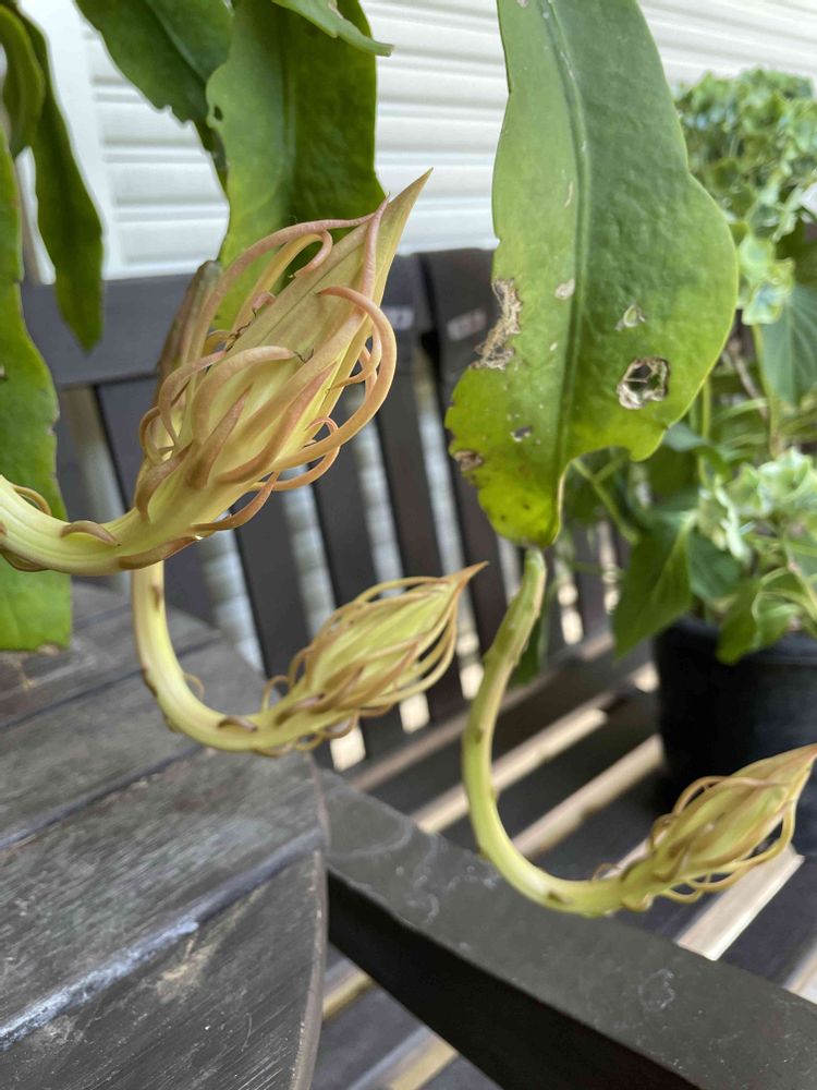 月下美人の蕾が4つ付きました。昨日から花首を持ち上げてきています。