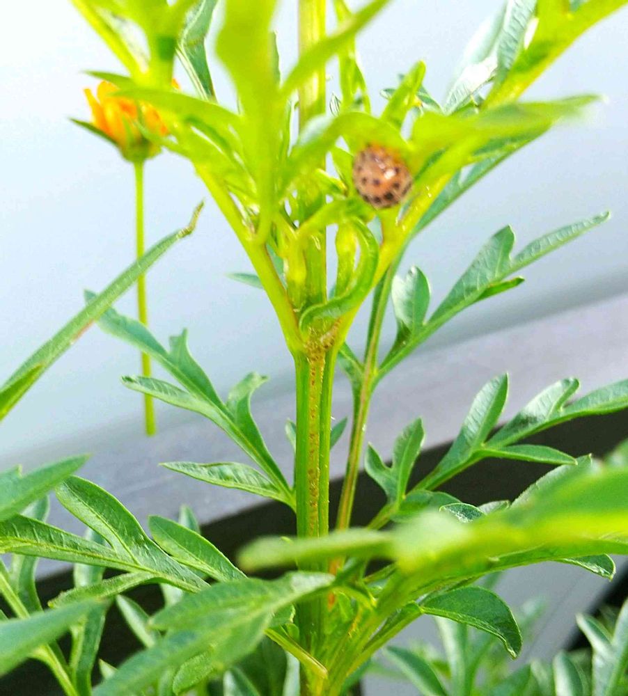 キバナコスモスにテントウムシダマシが来た初めて見たけど害虫だと言うのは分かってたから追い払った❗️😤