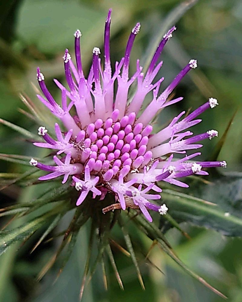 4⃣ 秋終盤、濃い紫色の雄蕊から少し雌蕊が伸びたアザミ、真ん中は蕾、白は花粉