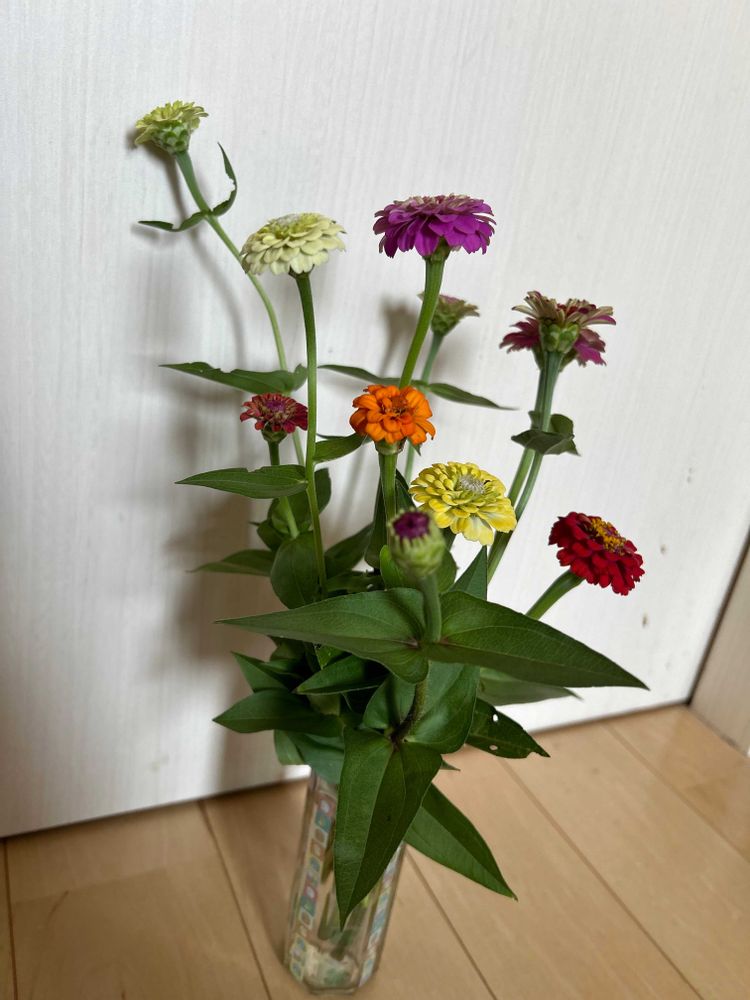 ジニアでしょうか。知り合いの方が、お庭に生えていたものを摘んで下さいました。切ってからも花持ちいいですね。