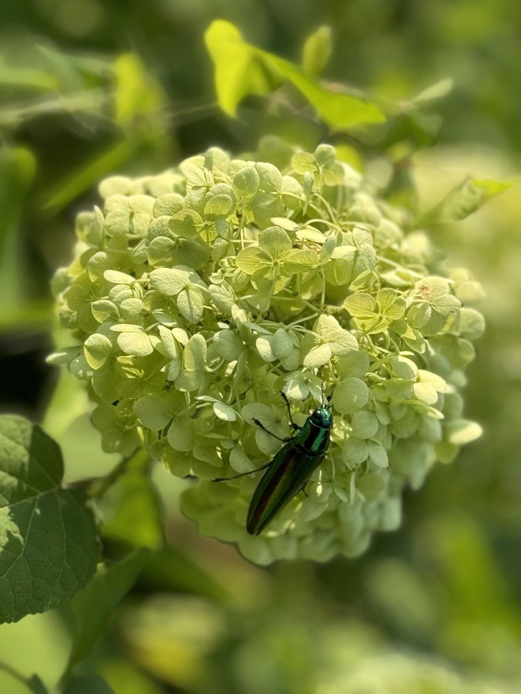 清楚なアナベルに光沢の鮮やかな緑色💚のアオナガアオムシさんが