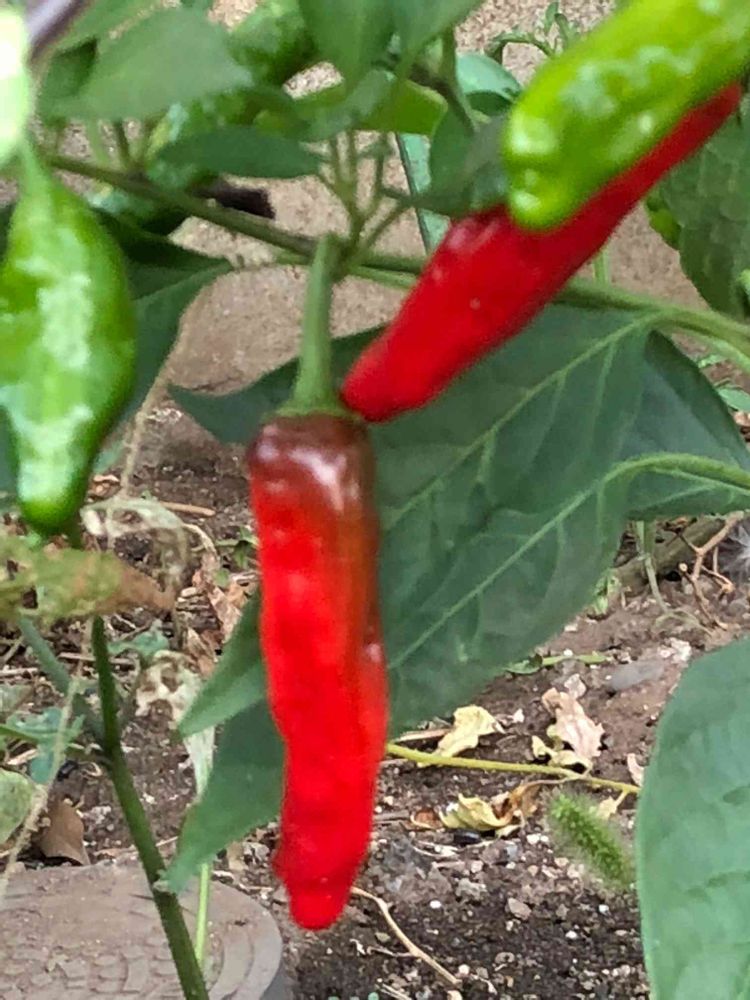 これは、ししとうじゃないかな⁉️私の庭にも一本あって、今日赤いのを食べました。パプリカよりも甘くて美味しかったです。🤗😂