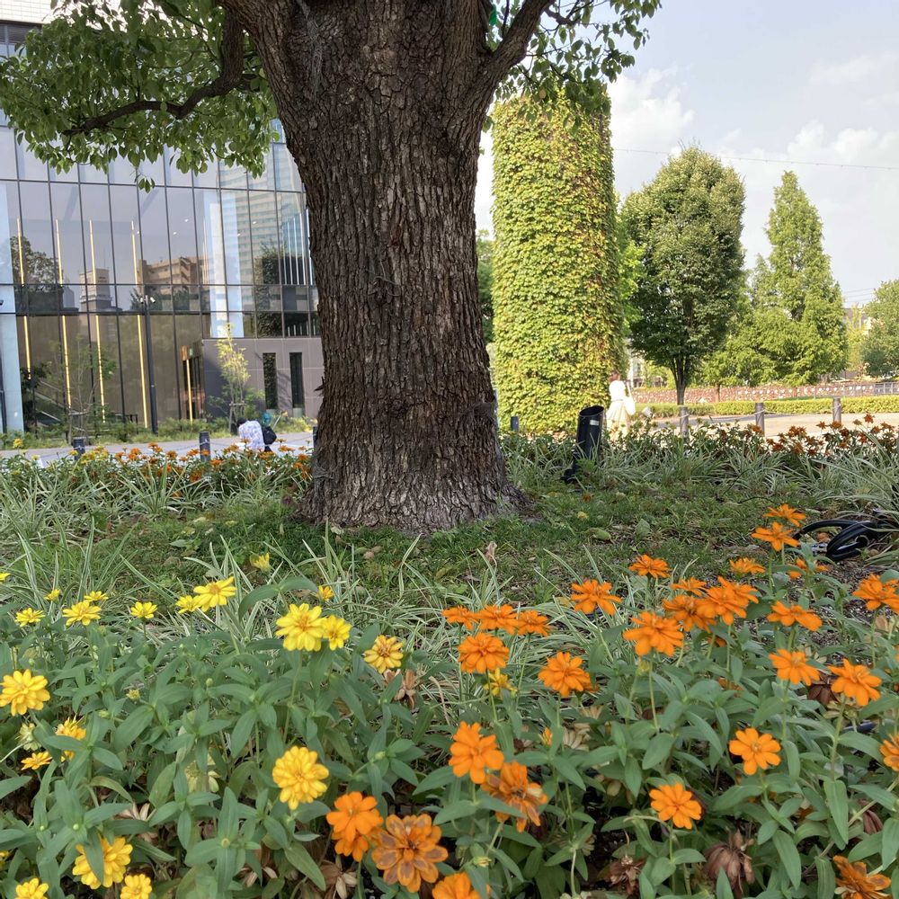 ③シイの木(?)の足元のジニア💛🧡
